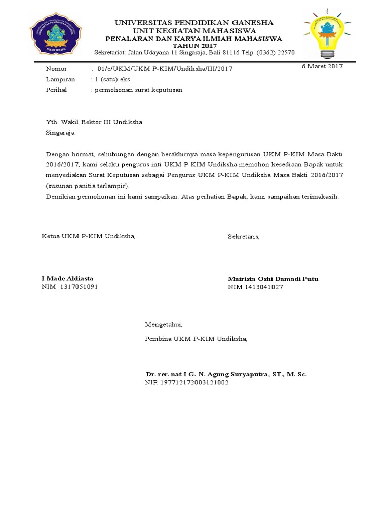 Unud Sinmawa Udayana Sk Susunan Pengurus Bem Pm Universitas Udayana Periode Tahun 2016 2017 from sinmawa.unud.ac.id Adapun surat permohonan sendiri ada yang bersifat resmi atau pun sebaliknya tidak resmi. Adapun susunan pengurus organisasi tersebut sebagaimana terlampir. Surat permohonan sk pengurus bem 2018. Sebagai dokumen pelengkap, bersama ini saya juga melampirkan: Salah satu faktor yang biasanya sering menjadi kendala adalah masalah yang berkaitan dengan finansial atau. Berikut ini adalah contoh surat permohonan pelunasan hutang melalui kta/kredit tanpa agunan.full description. Ada kalanya ketika kita sekolah, kuliah, bekerja atau lainnya dalam lingkungan sosial bermasyarakat baik itu di sekolah, kampus, kantor atau lingkungan kedaerahan, kita akan dihadapkan dalam situasi tidak dapat mengerjakan sendiri dan memerlukan bantuan, pertolongan, izin. Contoh surat permohonan izin melaksanakan penelitian.